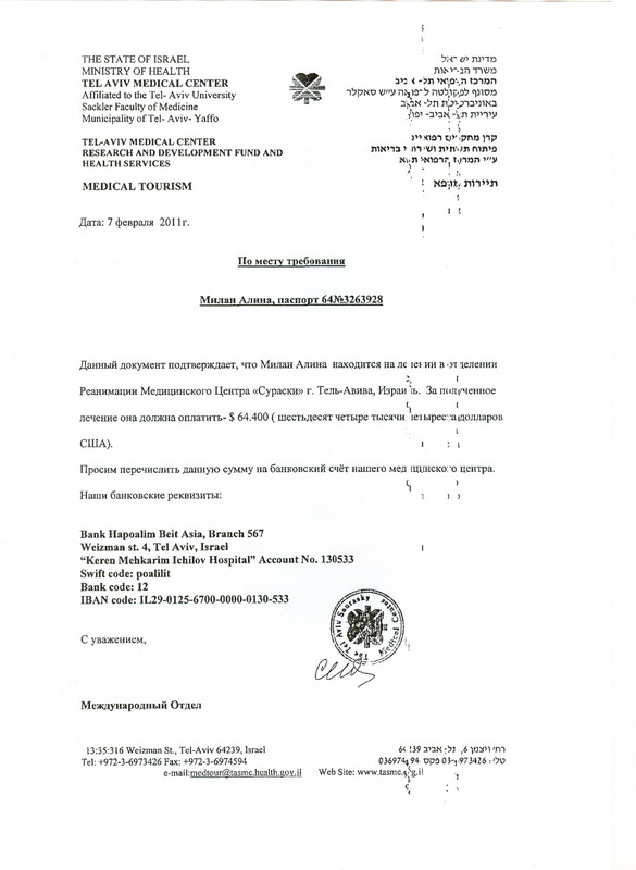 Моя дочь, Милан Алина, сейчас находится на лечении в Израиле, в Медицинском Центре «Сураски» (Ихилов ), в отделении реанимации, с диагнозом альвеококкоз печени, осложненный распадом и нагноением.