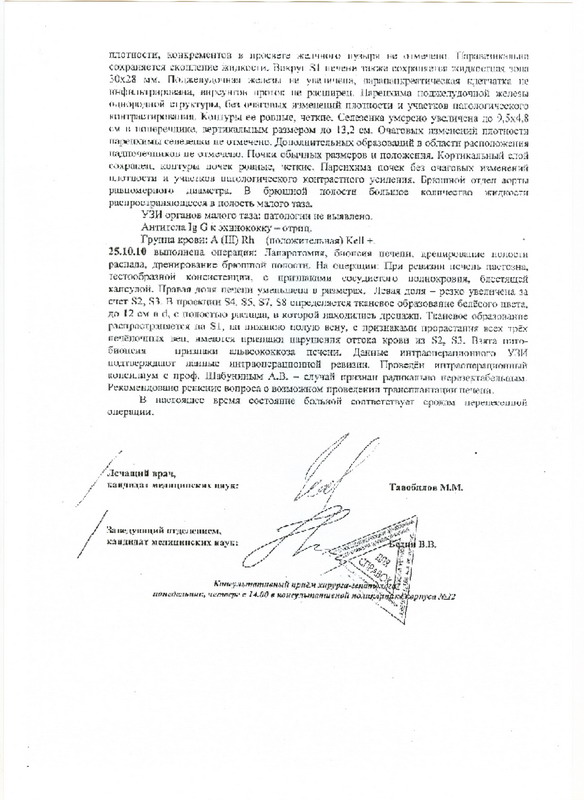 Заболела она резко, поднялась температура, потом пожелтела. Типичные признаки гепатита, поэтому, сначала ее увезли в инфекционную клинику, когда гепатит не подтвердился, перевели в Боткинскую, там сделали две операции по дренированию гнойного абсцесса, июль и август лечили абсцесс, потом месяц мы лечились дома. 25го октября сделали операцию, хотели удалить больную долю печени, но во время операции поставили диагноз - альвеококкоз, увидели площадь поражения, и поняли, что ничего сделать не могут. Поэтому зашили и предложили сделать полную трансплантацию печени. Шанс, что трансплантация пройдет удачно был ничтожный, я лично консультировалась с проф. Чжао А.В .. Мне его телефон дали общие знакомые. Со стороны врачей Боткинской, в том числе и зав. отделения Бедина В.В., были только обещания проконсультировать, все затягивалось. Состояние Алины ухудшалось, она уже перебралась в реанимацию, т.к. упало давление, начались перебои в сердечном ритме, и это все на фоне печеночной недостаточности - прямая угроза уже не просто здоровью, а жизни. Решение лететь в Израиль было принято быстро, мы с подругой (Рябова Виктория, контактное лицо в России, +7(916)677-67-22) по электронной почте разослали выписку из истории болезни и ссылку на компьютерную томографию во все крупнейшие клиники мира. Ихилов ответил одним из первых, предложения по лечению были конкретные, поэтому 11 ноября мы уже были в приемном покое этой больницы.