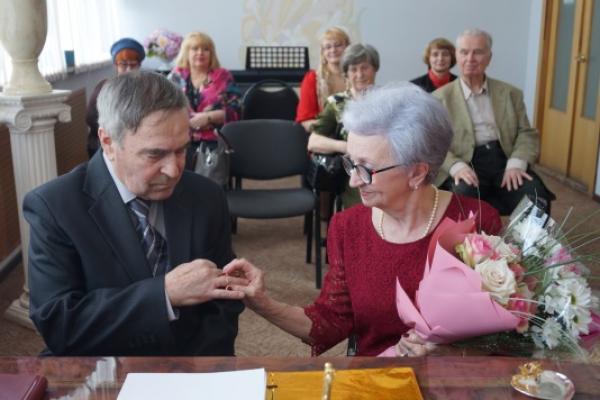 Председатель комитета по правам человека, местному самоуправлению, правопорядку, связям с общественными организациями и депутатской этике Дмитрий Меснянкин поздравил с золотой свадьбой семью Арефиных.