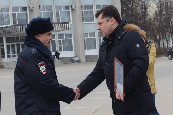 Глава города Сергей Попов вручил Благодарственные письма городского округа председателю Совета ветеранов Управления МВД России по г.Дзержинску Владимиру Кулакову и инспектору отдела по охране общественного порядка Управления МВД России по г.Дзержинску Илье Суслову в ходе открытого гарнизонного развода полиции города.