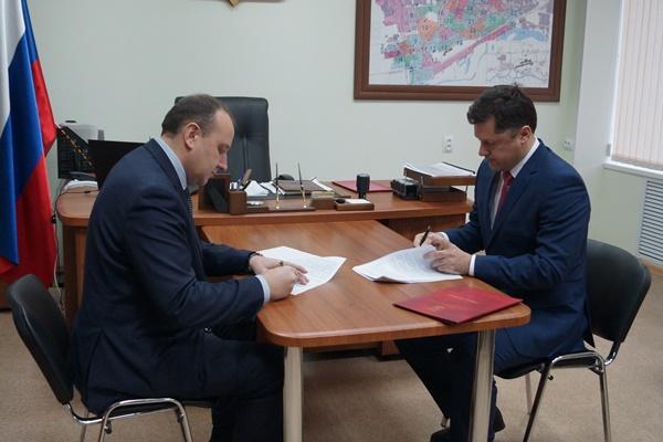 Глава города Сергей Попов поздравил Виктора Нестерова со вступлением в должность Главы Администрации после подписания контракта с назначенным руководителем исполнительной власти города.